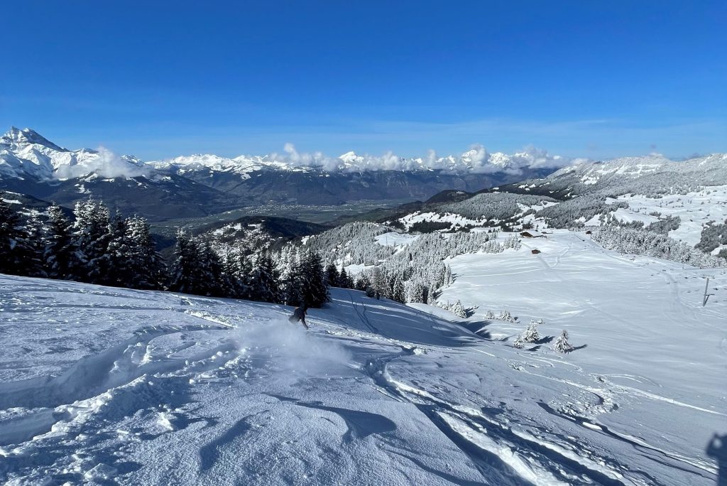 Gryon has more great skiing from Chaux Ronde summit, and this area’s highest Crois des Chaux (look for the cross). Here you’ll find a few fun prepared trails, plus gently sloped pastures you can ski on a powder day, and a plateau learning area, plus a few chalets for snacks and lunch. More on Gryon and Barboleuse villages below.