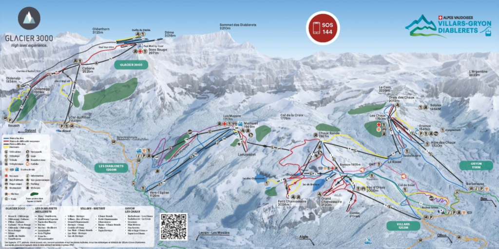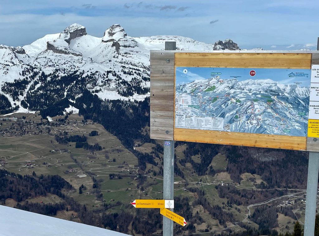Over in Diablerets is more fun ski terrain, and kids ski zones – reached by taking a long transfer lift back and forth from Villars called – Conche Mi Laouissalet. Diablerets has its own amazing views, and a fun trail all the way down to the base village. Diablerets’ views of the surrounding rock cliffs are stunning. Ride the Diableret Gondola to the first unload station offers a nice seperate trail to the base. Or take it to the summit for the other trail and connections back to Villars-Gryon. At the base of Diablerets is a small ski village, and here you catch the bus to transfer to Glacier 3000. Note the trail map is not to be relied upon, not to scale and not always accurate.
