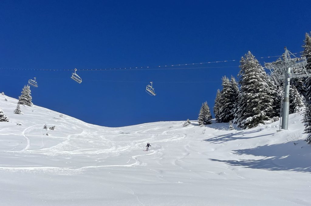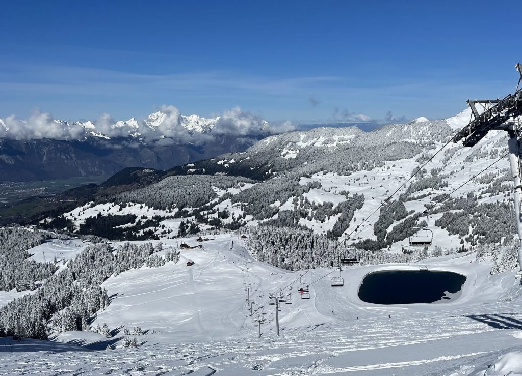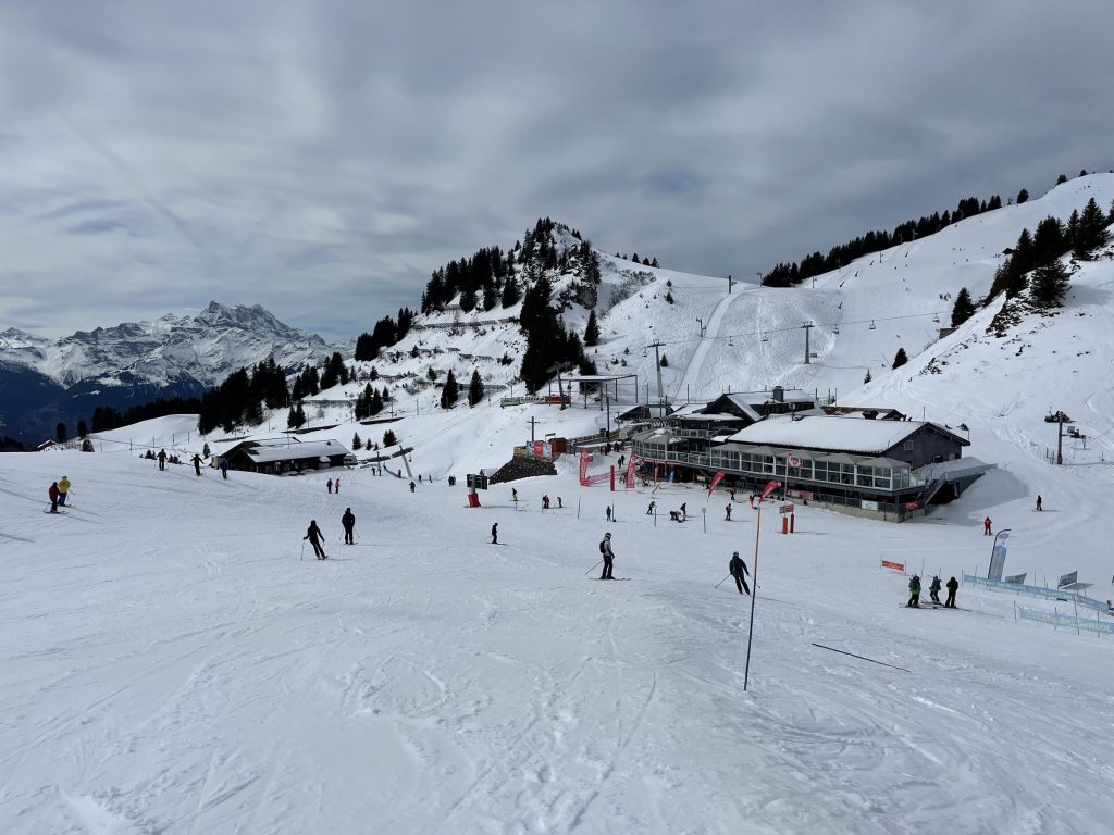 From Bretaye in Villars is a network of ski lifts both modern and old-school – T-Bars and Pomas, plus quads, six-packs and an eight-passenger chair. Elevations are not high, just below 2000-meters (6,500’), so early and late snow can be marginal. The lifts and trails at Villars Gryon were designed in the late 1930’s and 40’s – more plentiful snow years, now much of the lower mountain terrain is not skiable in an average or lean snow year, and several lower mountain surface-lifts are now defunct.