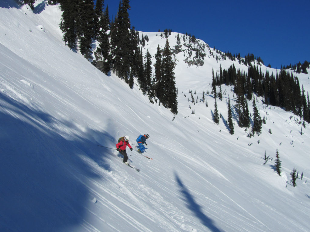 Our Heli Ski Guide at Purcell Heli Skiing said, there is low probability but high consequences in heli skiing. The dangers are dramatically reduced by selecting a reputable heli ski company, paying attention to the morning safety briefing, heeding your guide’s instructions all day, being aware of your surroundings, and skiing with skill and care. Ski only where your guide has cleared and stay clear of tree wells. I was surprised to learn that tree wells are as hazardous to skiers and snowboarders as avalanches. Yet another reason to give plenty of girth to the trees when skiing glades.