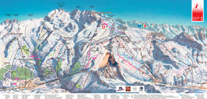 Zermatt Ski Stats: 12,791′ Summit, Vertical drop: 7,477′, 53 Lifts, Prepared Trails/Pistes: 153 miles, glacier skiing and more terrain interconnected to Cervinia, Italy. Hire a guide/bergfuherer to explore 1,000s of acres of off-piste terrain.